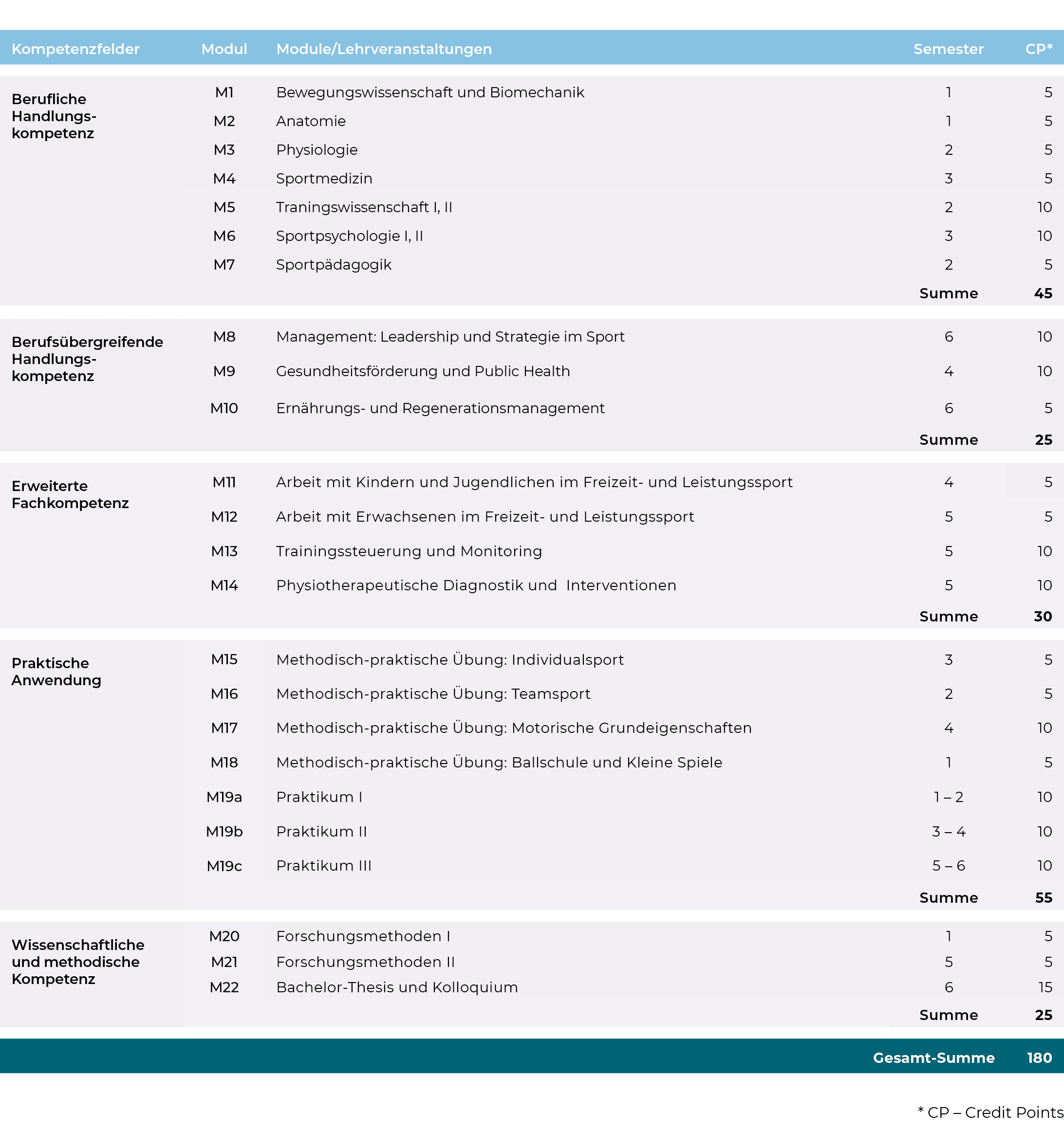 Der Bachelorstudiengang Sportwissenschaft vereint sportwissenschaftliche, medizinische, psychologische und pädagogische Inhalte. Ein besonderer Fokus liegt auf athletikorientierten und zielklientelbezogenen Themen wie: