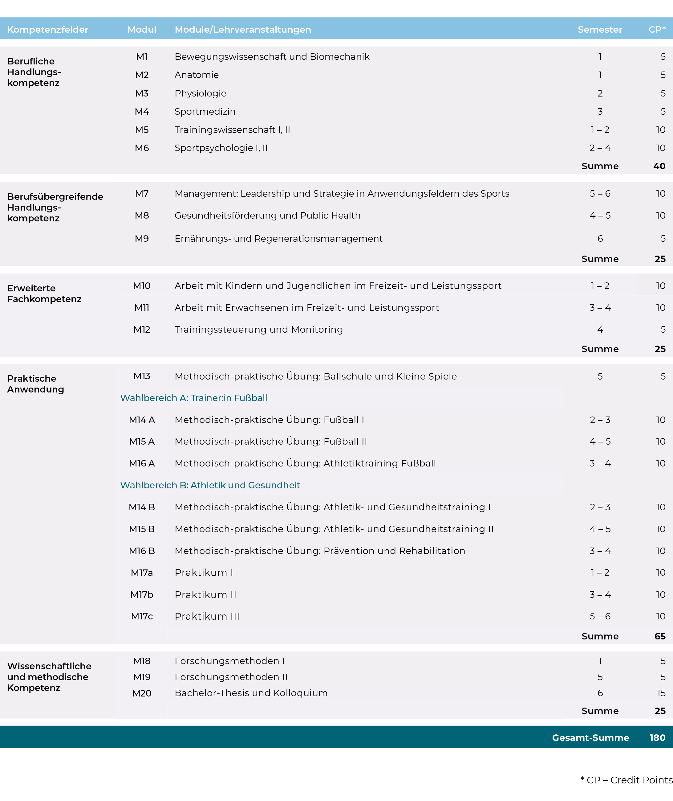Die Studierenden lernen, individuelle Leistungsprozesse gezielt zu begleiten, Teamdynamiken zu fördern und langfristige Entwicklungsstrategien in der Arbeit mit Kindern, Jugendlichen und Erwachsenen umzusetzen. Integriert in das Studium ist der Erwerb der C-Trainer:innenlizenz Fußball.